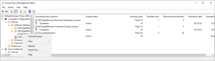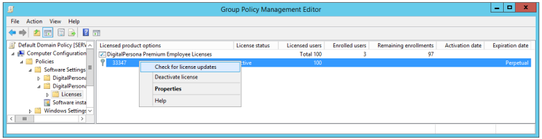 1. In MMC, navigate to Computer Configuration, Policies, Software Settings, DigitalPersona Server, Licenses.