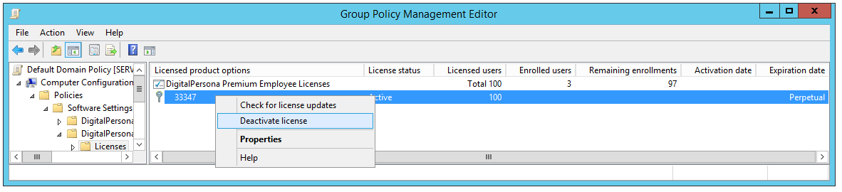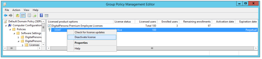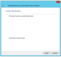 Your DigitalPersona license may be deactivated through the DigitalPersona Deactivation Wizard, launched through the Active Directory Group Policy Management Editor on the computer where the DigitalPersona Server is installed.