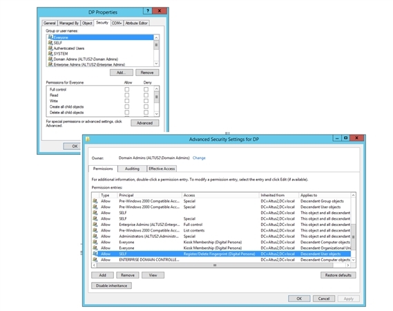If it is necessary to not have inheritance to user or OU objects, the Register/Delete Fingerprint permission can be added directly via the object or parent object's Security tab in AD Users and Computers.