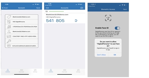 The instructions that follow are for the DigitalPersona app as installed on an Apple iPhone®. Instructions for the use of other authentication apps and devices may differ slightly.