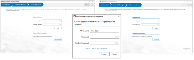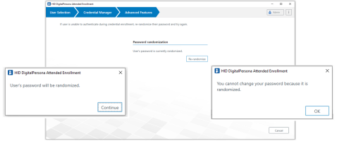 The behavior of the page will vary depending on the value of the passwordRandomization tag in the file, DigitalPersona.Altus.Enrollment.exe.config.
