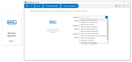 The Recovery Questions credential allows a DigitalPersona user to regain access to their Windows account by answering a series a questions that have been previously configured.