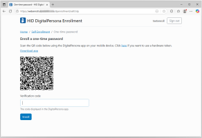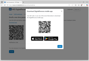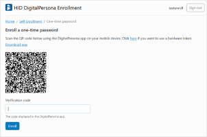 From a link in the One-Time Password window, you can download an OTP authentication app from various platform-centric app stores. You then enroll the OTP credential for use with the authenticator app (and OTP Push Notification, if configured and in the DigitalPersona app only) by scanning the QR Code shown on the screen.