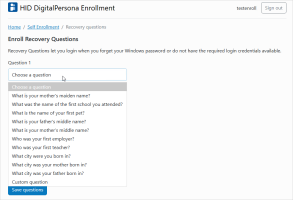 The Recovery Questions credential allows a DigitalPersona user to regain access to their Windows account by answering a series a questions that have been previously configured.