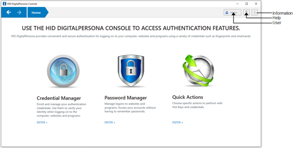 The DigitalPersona Console is the central location for primary access to DigitalPersona Workstation features and settings.