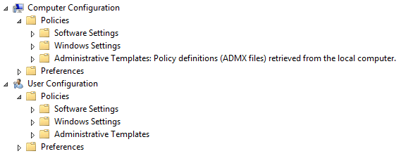 There are three child nodes under the Computer Configuration and User Configuration parent nodes in the Group Policy Object Editor namespace: