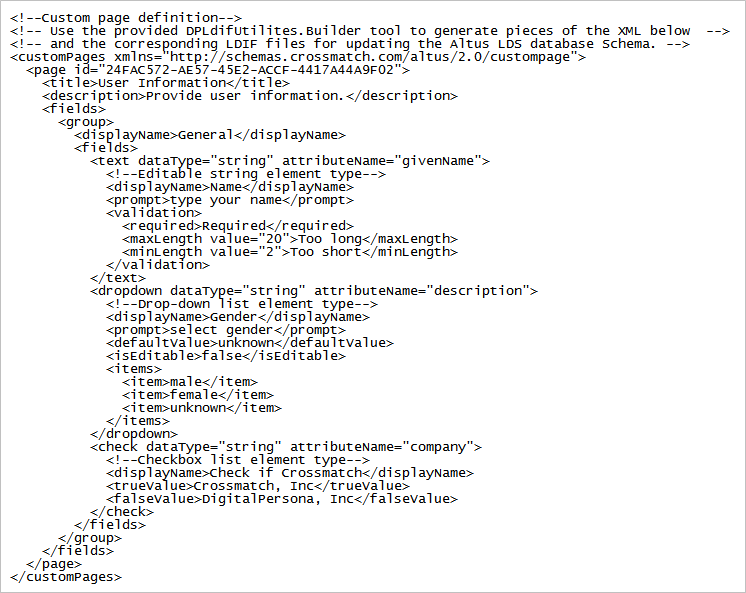 Elements used in the Custom page definition section must already exist in the DigitalPersona LDS database, or be added to the database using the DPLdifUtilities.Builder.exe and DPLdifUtilities.Import.exe server tools. These are located in your DigitalPersona LDS Server product package, in the Server Tools folder.