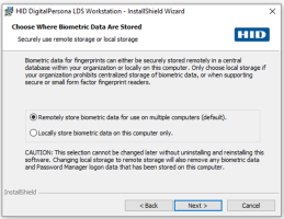 Biometric data for fingerprints can either be securely stored remotely in a central database within your organization or locally on this computer. Only choose local storage if your organization prohibits centralized storage of biometric data, or when supporting secure or small form factor fingerprint readers.