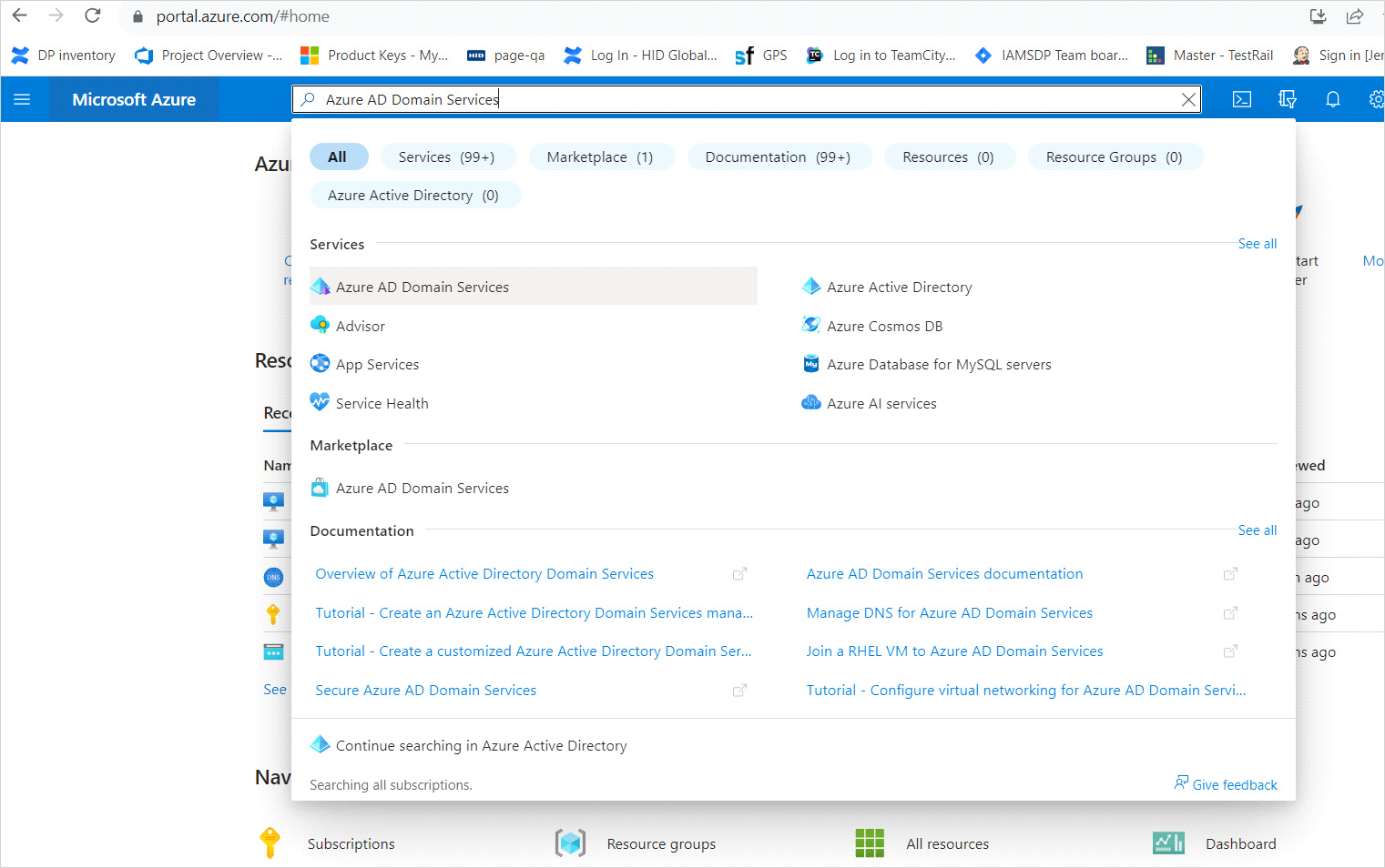 Enter Domain Services into the search bar, then choose Azure AD Domain Services from the search suggestions.