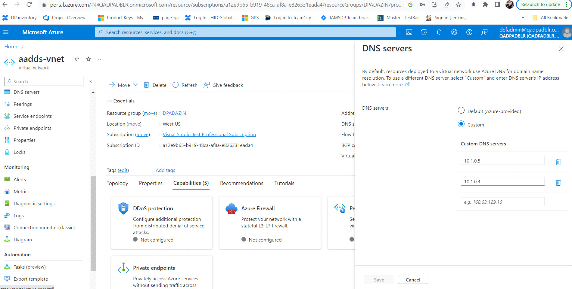 To provide this connectivity, update the DNS server settings for your virtual network to point to the two IP addresses where Azure AD DS is deployed.