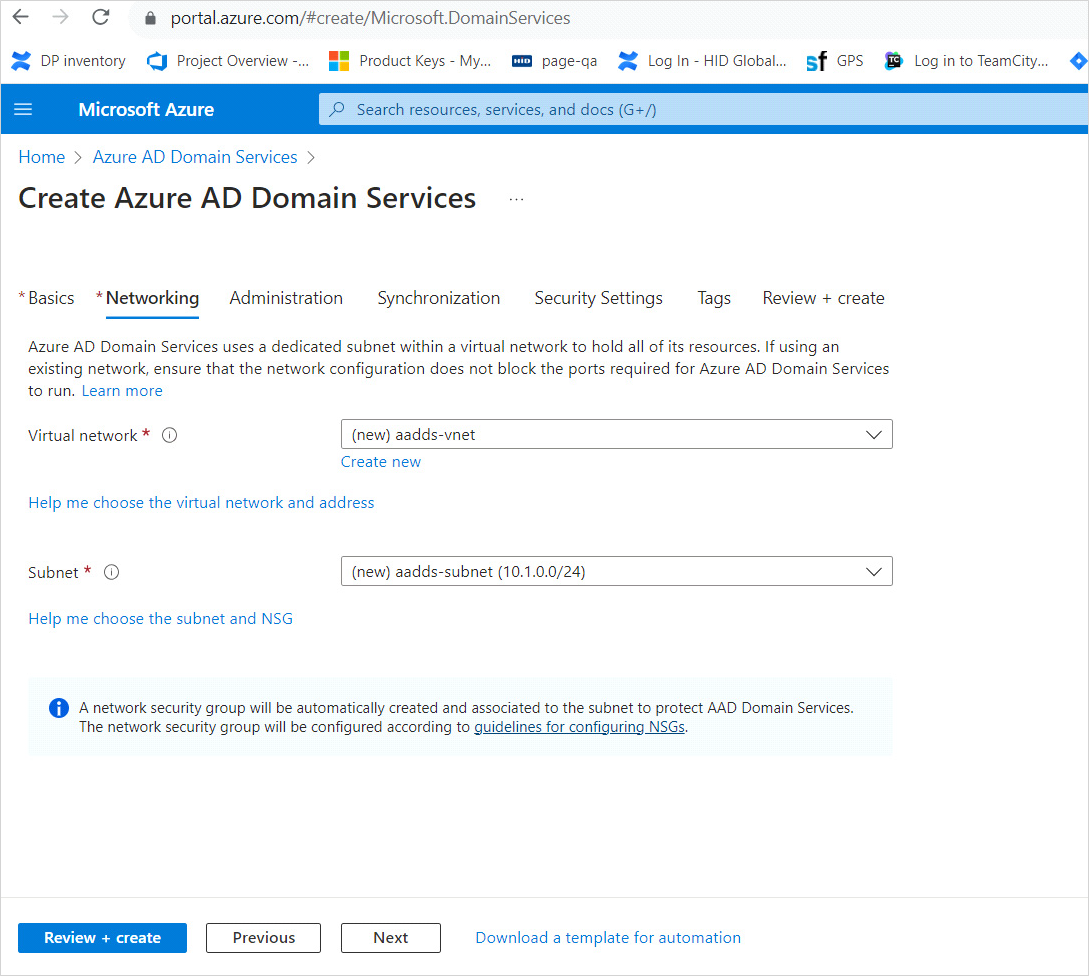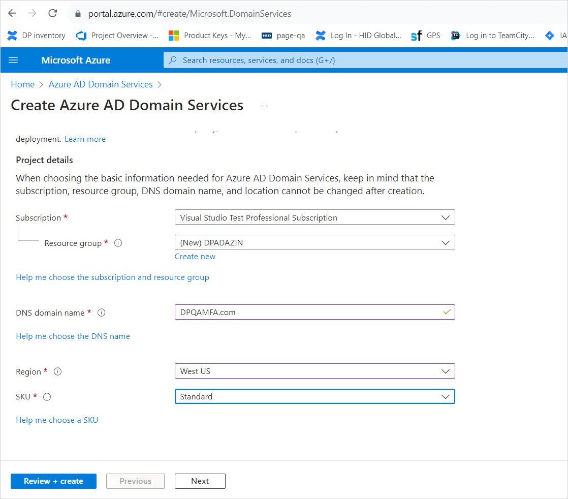 To quickly create a managed domain, you can select Review + create to accept additional default configuration options.