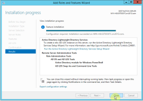 Note: You can close the wizard (by clicking the Close (X) button) without interrupting the installation, and open it again to view progress by clicking Notifications and then Task Details in the Server Manager Dashboard Command Bar. -