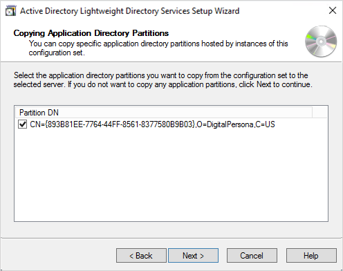 If no Application Directory Partition is shown, this may indicate that the DigitalPersona AD LDS Configuration Wizard was not run on the initial AD LDS instance. Close this wizard, return to the original instance and run the configuration wizard there before continuing.