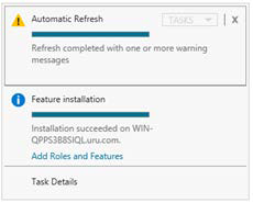Closing the above dialog leaves the Add Roles and Features Wizard page on the screen. Additional tasks will be running, but you can close this page without interrupting them. You can open the page again by clicking Notifications in the command bar and then Task Details.