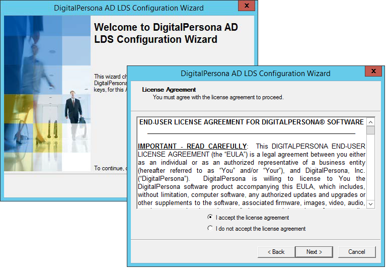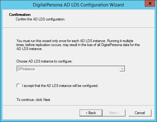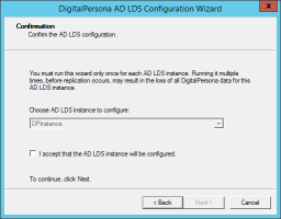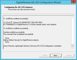 Configure the Active Directory Lightweight Directory Service by running the DigitalPersona AD LDS Configuration Wizard.