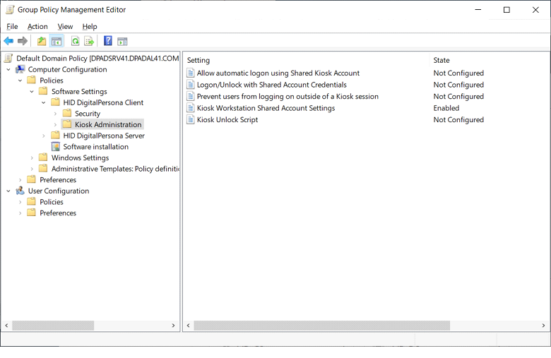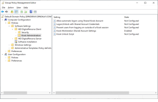 You can use the Group Policy Editor to modify DigitalPersona settings. For the Kiosk Shared Account Settings, at the OU level for the kiosk, open the Kiosk Administration node and double-click Kiosk Shared Account Settings.