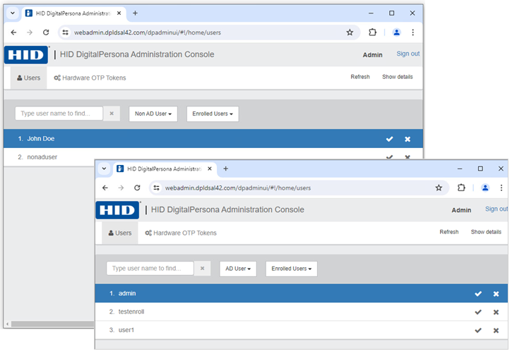 The HID DigitalPersona Administration Console provides a convenient web-based way to administer DigitalPersona users