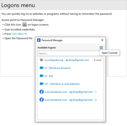 Press the hot key combination Ctrl+Win Logo Key+H to open the Logons menu and then click DigitalPersona Console (when no logons have been created yet) or Manage (after logons have been created).