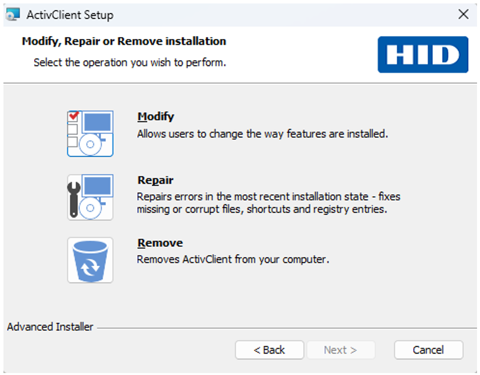 After installing ActivClient, you can modify the ActivClient installation by adding or removing components.