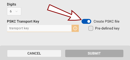 Choose whether the Create PSKC Files Files used to securely transport and provision symmetric keys to cryptographic devices or software, following the Portable Symmetric Key Container (PSKC) format. toggle in the One-Time Password Configuration dialog will be set to True or False