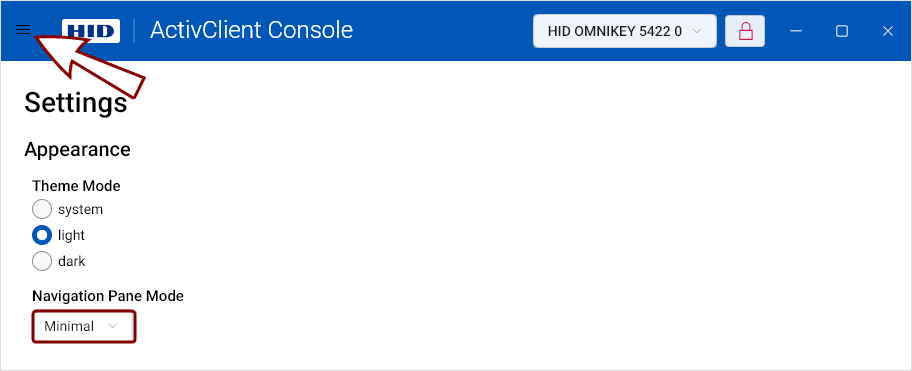 Minimal: Navigation pane items are not displayed. You can access these items by clicking the hamburger menu icon in the top-left corner of the application window.