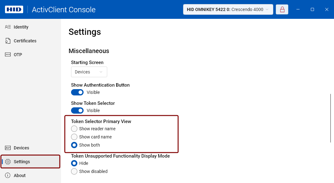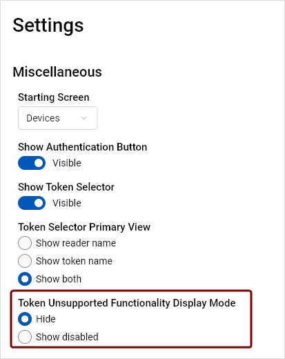 Choose how features that are not supported by the connected token are displayed in the Console: