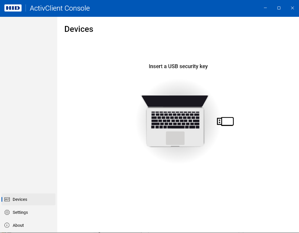 If no token is connected, the interface prompts you to insert a USB security key or a smart card: