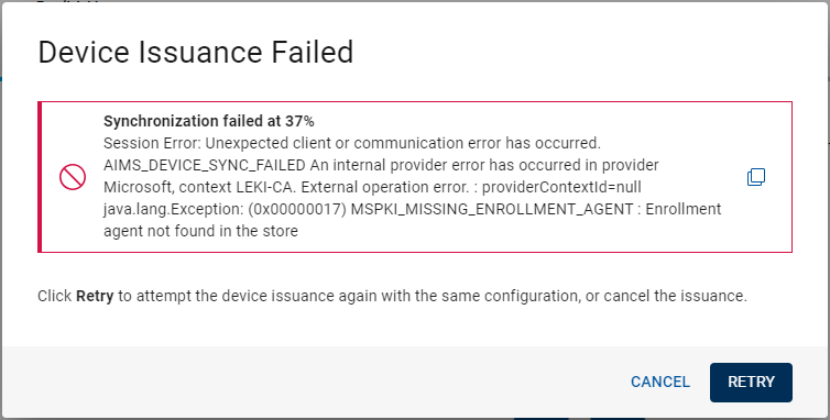 Clicking Retry starts the issuance again using the same device with the same policy. Do not remove the device from the reader,