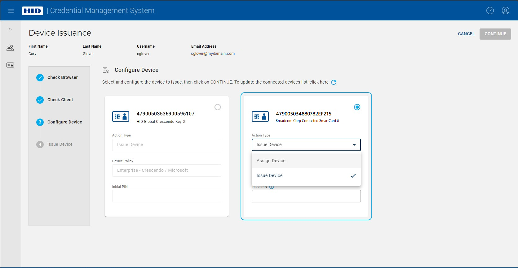 Note: If you want to try to issue the device again using a different policy or a different PIN, you must cancel the current issuance and start a new one.