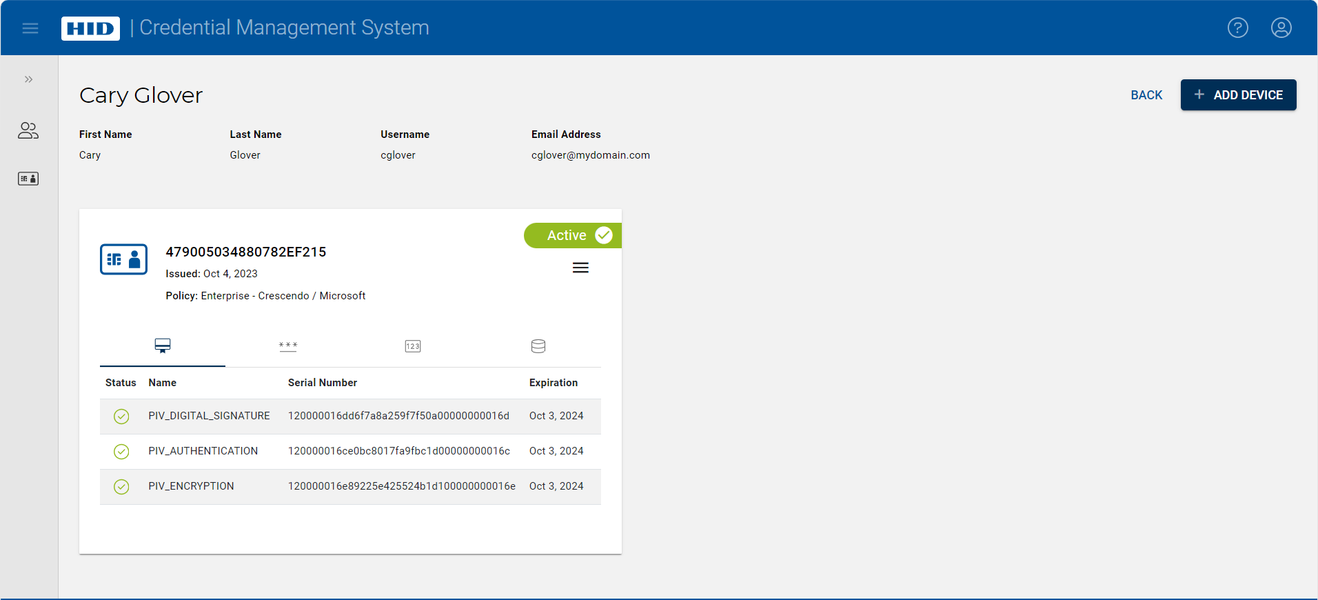 After the issuance is completed successfully, the User page is displayed again. The page now displays details about the newly-issued device: