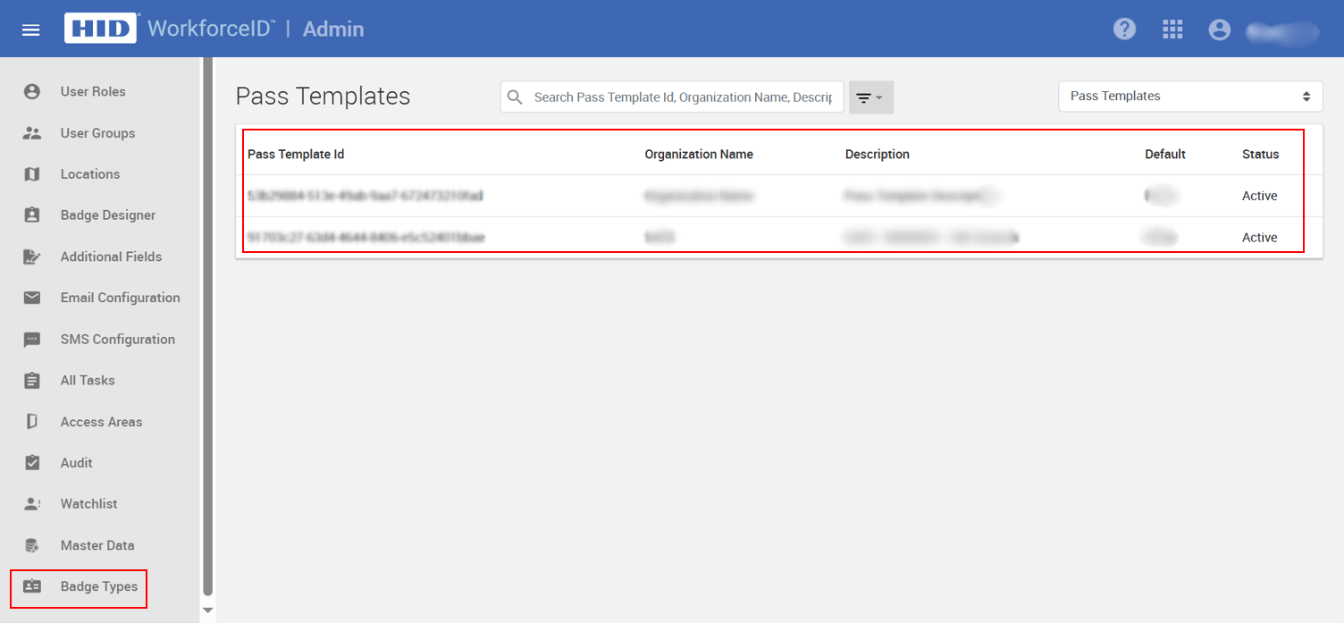 Choose Pass Templates from the top right corner drop-down menu. The page lists the pass templates broadcasted from HID Origo.