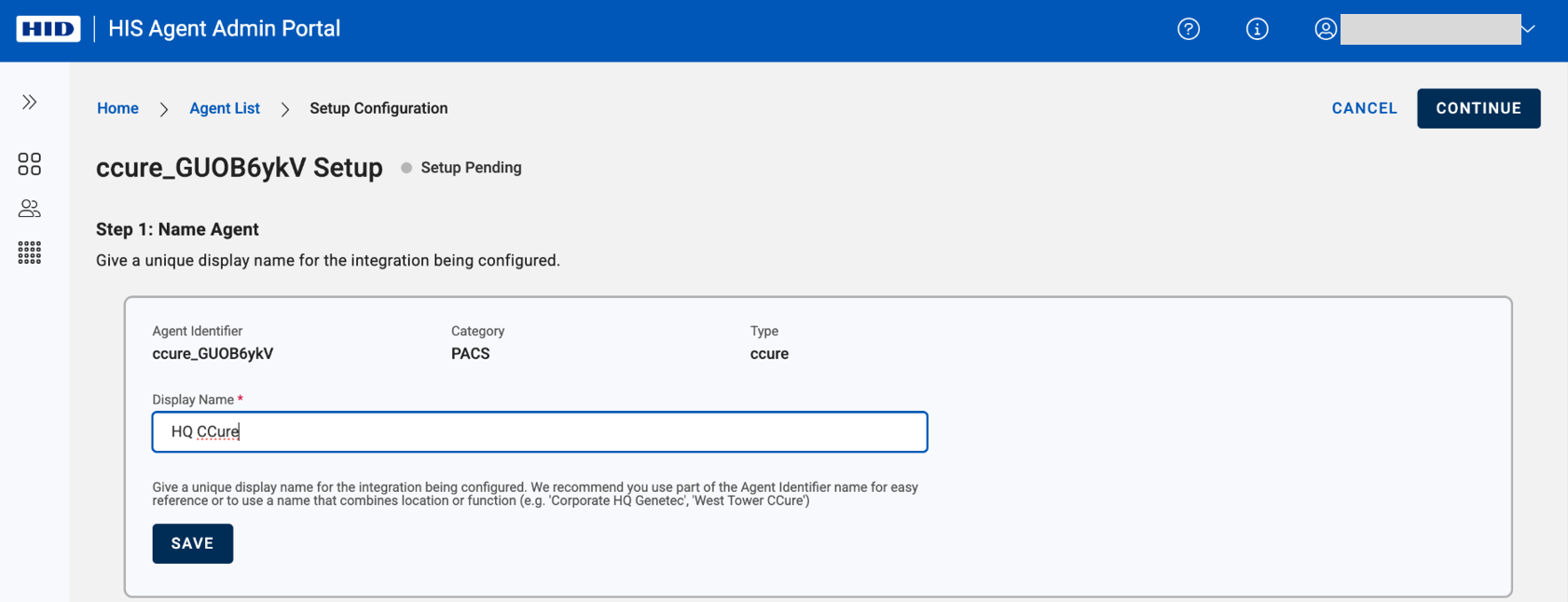 Begin by assigning a unique name to your agent. The name could reflects the location or function of the agent or anything that helps you remember this later.