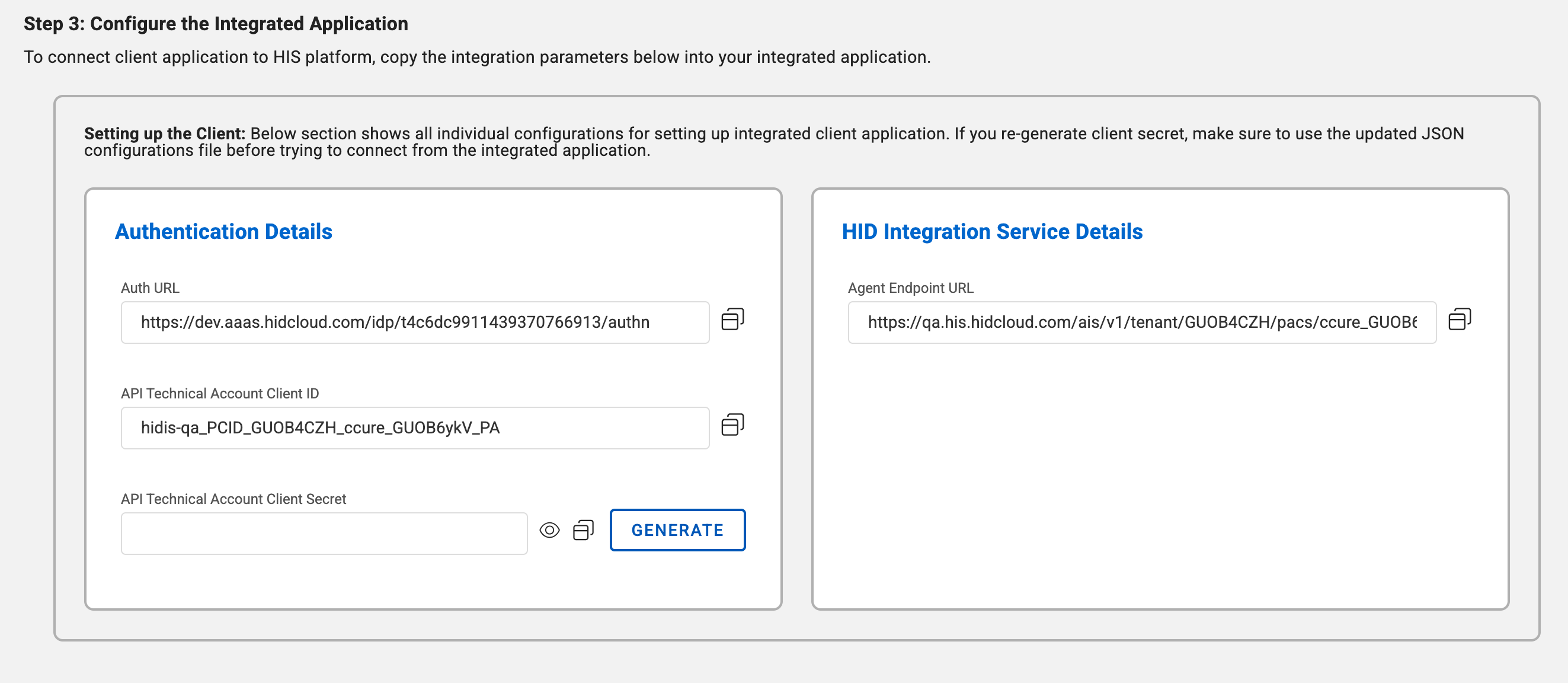 Connect the integrated client application to HIS by copying the following information from Authentication Details and HID Integration Service Details sections: