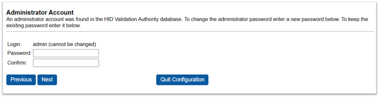 Important:During a first-time Validation Authority configuration, you must remember the login name and password that you specify in this step. The Administrative account that you specify during this step is the only account created by the configuration procedure that has access to the Validation Authority Management Console. This account is created with Administrator, Auditor, and Officer roles. For more information, refer to the Log On to the Management Console.