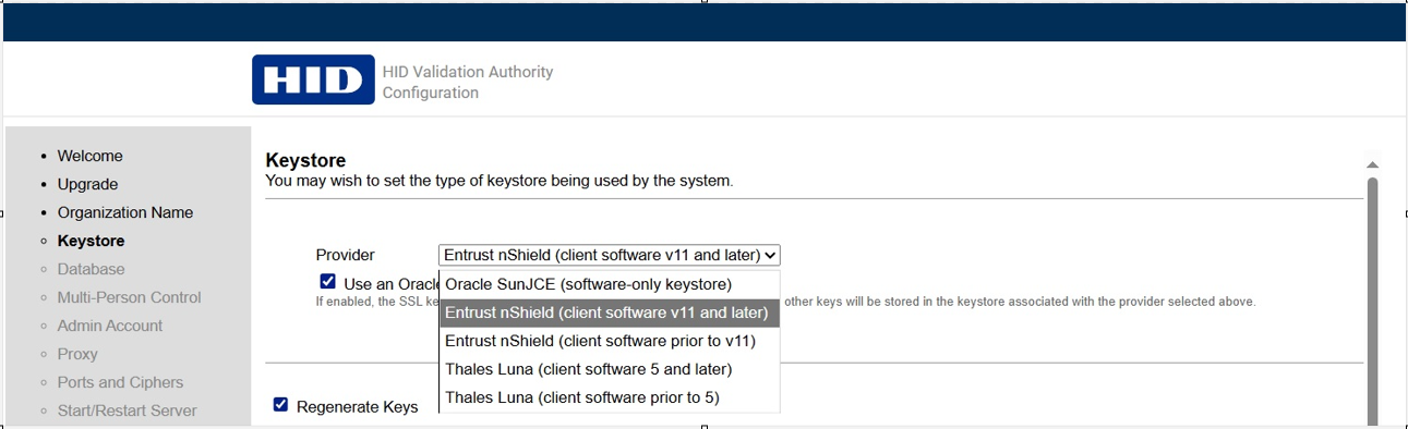 Note: If you are using an HSM, then please consider utilizing this option (see previous Important note). All crypto operations required by SSL ciphers are implemented by HSM vendors (or Oracle Sun Java JDK in the case of an Oracle SunJCE provider). They are not implemented by HID Global. Recent changes in Java SSL implementation are not compatible across the board with JCA provider implementations by HSM vendors.About the Regenerate Keys option: You must be careful to determine whether or not to regenerate keys and which keys to regenerate.