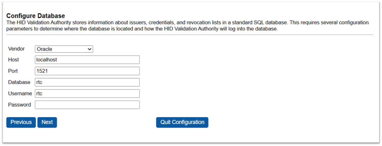 After you have installed and configured the Oracle database, you must configure the Validation Authority software to use that database, as described in section steps, as illustrated next.