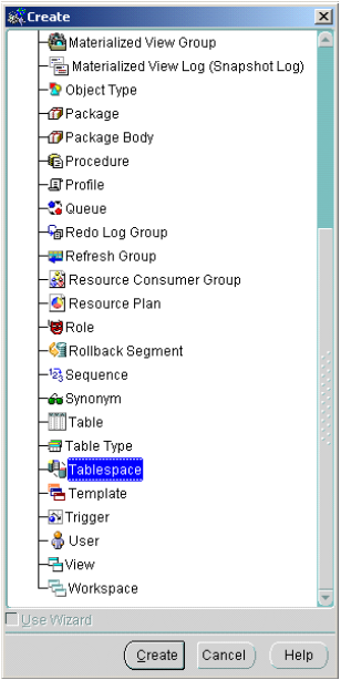 To create a new database tablespace, select Object > Create. The Create navigation tree is displayed. Perform the following steps to create the new tablespace: