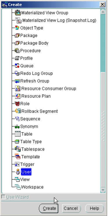 To create a new Oracle user account and grant it access to a database tablespace, select Object > Create. The Create navigation tree is displayed.