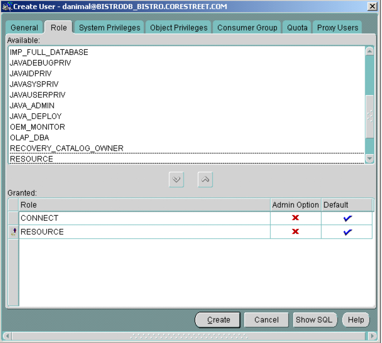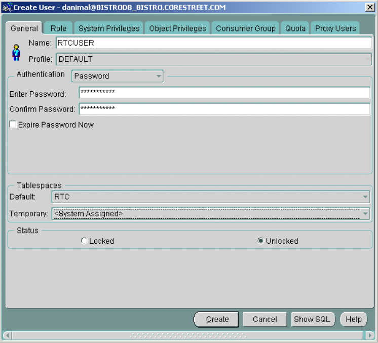 sqlplus> grant connect, resource to rtcuser;In this example, the user account rtcuser with password rtcpass is granted access to database tablespace rtc.