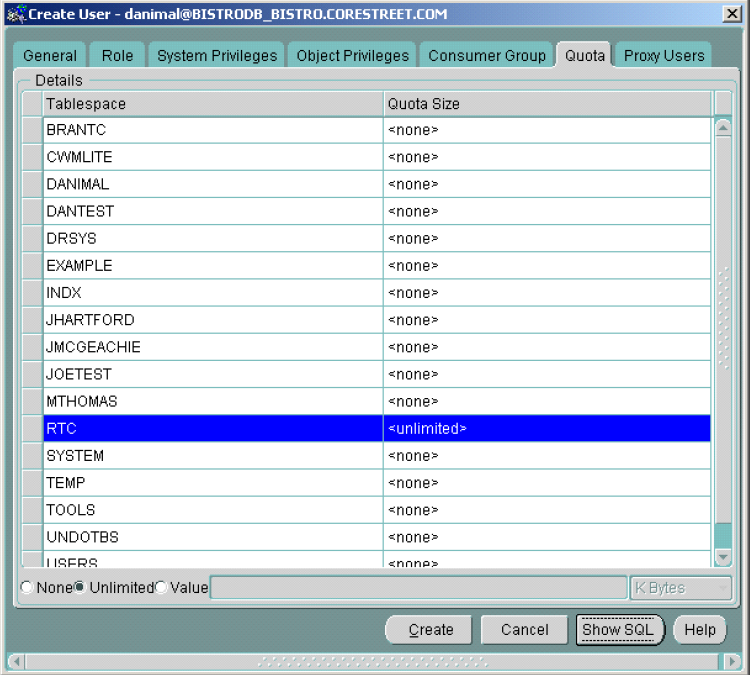 Select the Quota tab. Select RTC from the Tablespace list, and then select the Unlimited option.