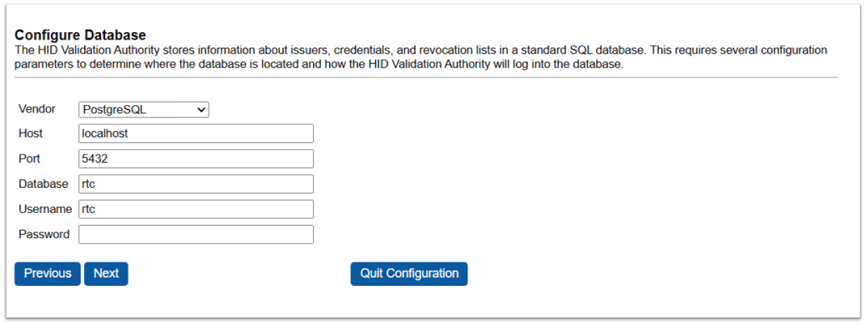 After you have installed and configured the PostgreSQL database, you must configure the Validation Authority software to use that database, as originally described in section Start Validation Authority Configuration.