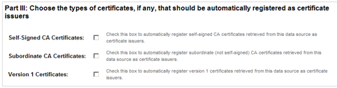 Subordinate CA Certificates - To automatically register subordinate (not self-signed) CA certificates retrieved from this data source as certificate issuers.