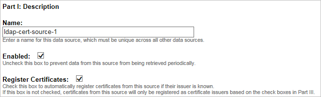 This is the unique identifying name of the data source (for example, ldap-certificate-source1). This distinguishes this source from the other data sources so that it can be referenced individually.