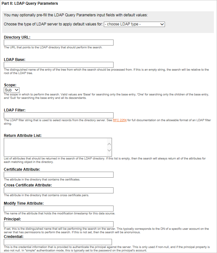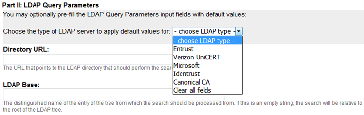 If you use a listed CA (Entrust, Microsoft, Identrust) as your directory server in the Choose LDAP type drop-down list, then select it in order to use the appropriate template.