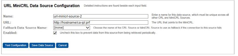 To add a new URL MiniCRL data source, click configure a new URL MiniCRL data source. The MiniCRL Data Source Configuration page is displayed.