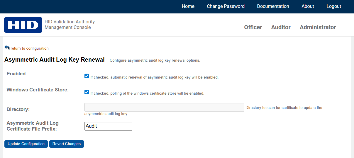 Enter the common prefix name in the Asymmetric Audit Log Certificate File Prefix field as explained below: