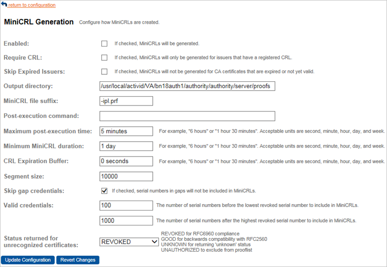 To configure the location of the output directory where MiniCRLs are stored, enter the location in the Output Directory field.