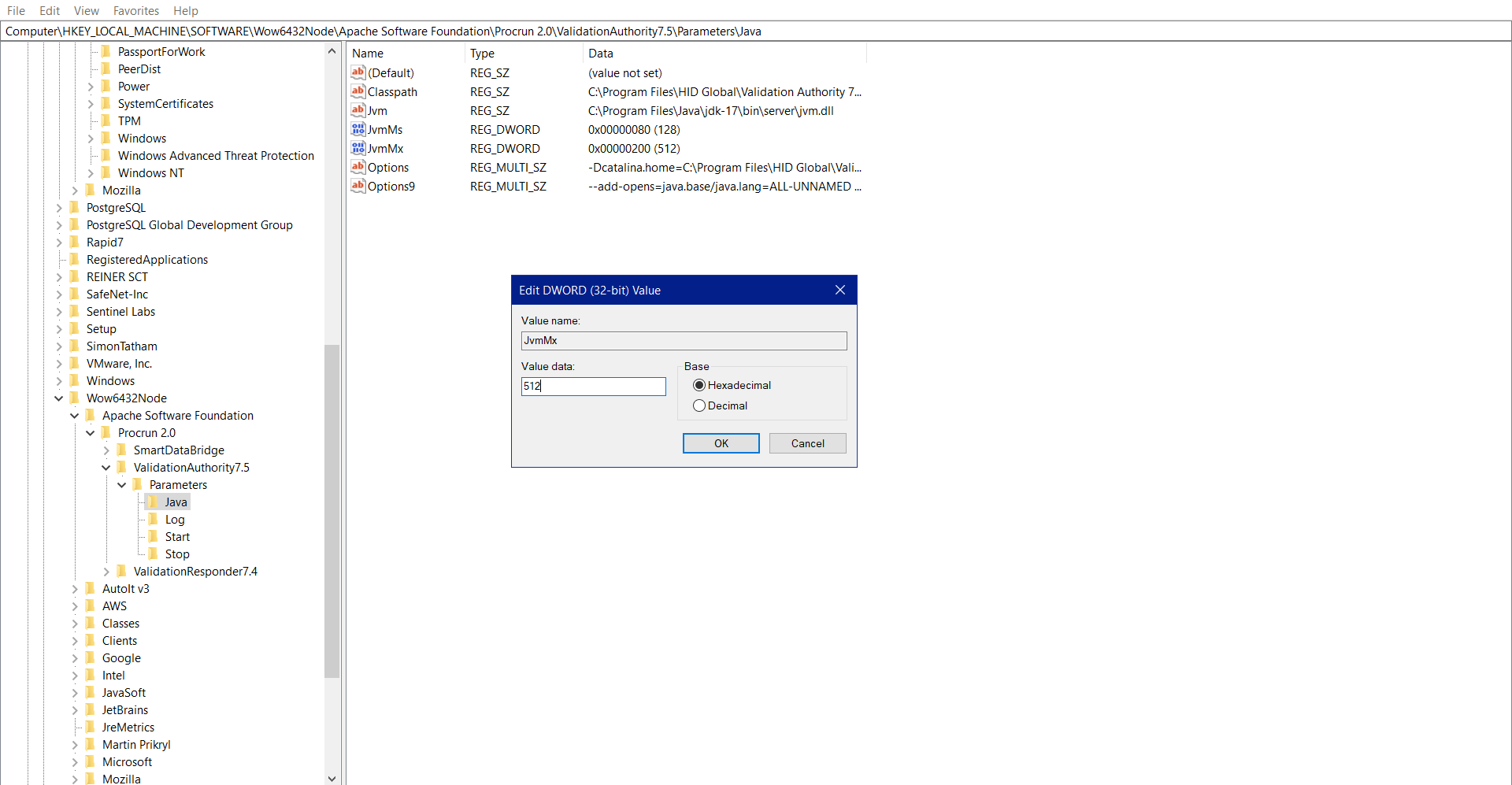 Go to: HKEY_LOCAL_MACHINE\SOFTWARE\WOW6432Node\Apache Software Foundation\Procrun 2.0\ValidationAuthority7.5\Parameters\Java on the Windows registry, update the key JvmMx value to 4096 in decimal.