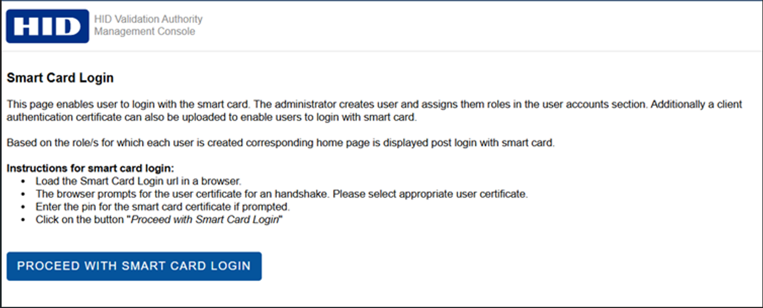 You will be landed in the Smart Card Login Page. Click PROCEED WITH SMART CARD LOGIN button to log on to the Validation Authority Management Console.