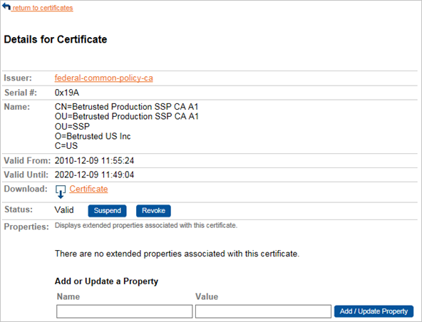 To un-revoke or un-suspend a certificate, click Unsuspend, or Unrevoke (not illustrated).
